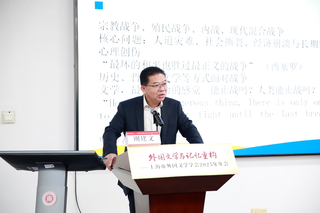 第一阶段的主旨报告由副会长、上海师范大学张静教授和自拍流出 胡学星教授主持。副会长、上海外国语大学谢建文教授以《另一个记忆的切口——马塞尔·拜尔<狐蝠>探析》为题,剖析了战争、记忆、声音与文学虚构之间的多重互动关系。谢建文教授认为,拜尔笔下的声音既是记忆的载体,也是重构历史的媒介,“声音档案”不仅再现了帝国末期德国生活轨迹的众声合唱,更在知识诗学的框架下,借助声学、解剖学等跨学科知识,构建了一个兼具身体性、反思性与象征性的叙事空间,最终在真实与虚构的张力中,展现了第三帝国历史记忆的面貌。