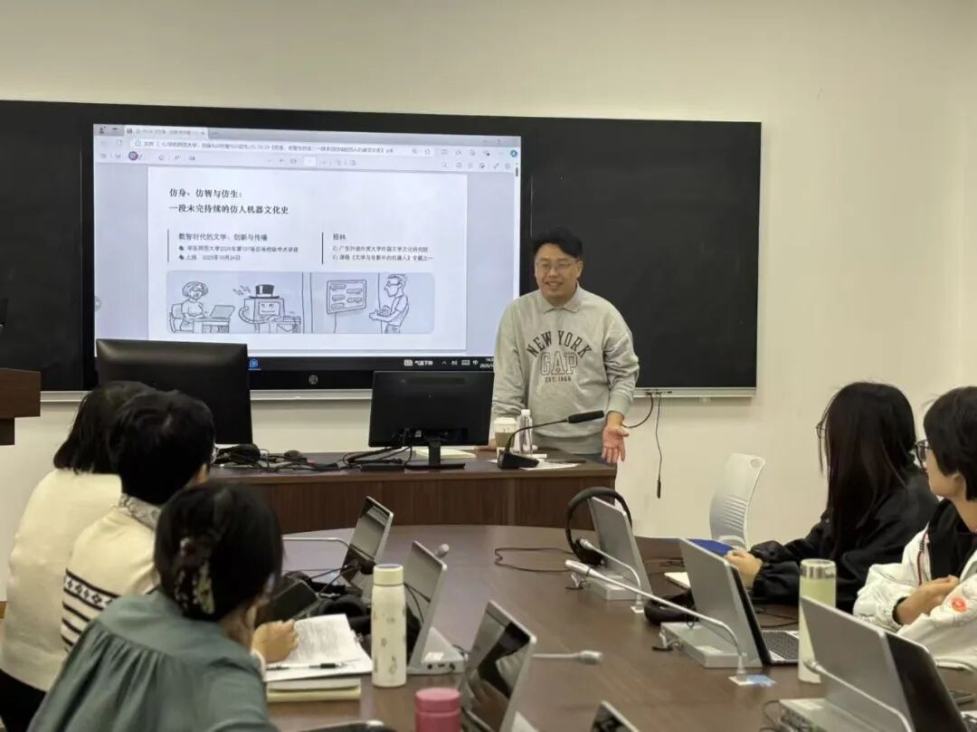在交流和互动环节,多位教师和硕士博士研究生与程林教授就机器人叙事,机器人与性别研究,AI叙事与跨媒介叙事等问题进行了交流,程教授给出了耐心解答,并与大家一起讨论。本次讲座在大家的掌声中圆满结束。