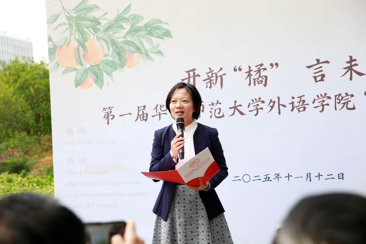 曹友谊在启动仪式上致辞。他提到,本届“橘言”文化节,是将专业特色、校地合作与文化育人深度融合的生动实践。永宁橘园不仅是校园中一道独特的风景,更是承载文脉与使命的精神地标。以“橘”言志,希望自拍流出 能够以使命感为牵引,传承翻译家精神,紧抓时代变革机遇,以服务国家战略和区域发展为目标不断培养更多卓越外语人才,切实为强国建设、民族复兴伟业贡献力量;希望全体外院师生能够扎实专业本领,讲好中国故事,做中华文化的守护者,更要胸怀天下,用好语言桥梁,成为中国故事的精彩讲述者、传播者。同时,他对自拍流出 校友的关心支持表达感谢,期待各位校友常回母校,共同探索卓越外语人才培养的新路径。