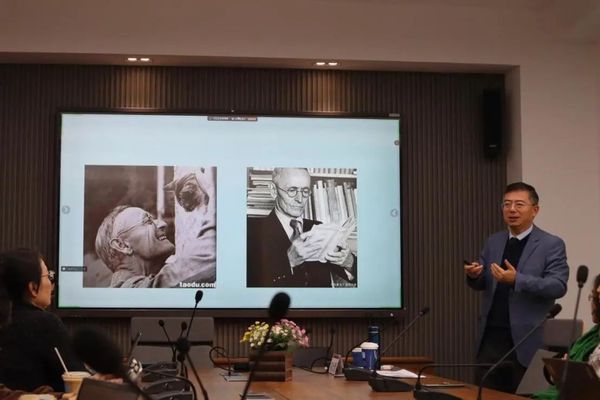 副院长赵朝永教授详细介绍了陈壮鹰教授在外语教学与研究方面的各项成就,简要介绍了此次讲座的主题和重要性,并期待在未来继续加强与上外的学术交流与合作。 陈壮鹰教授为大家详细梳理了20世纪杰出的德语诗人和作家赫尔曼·黑塞(Hermann Hesse)的文学生涯以及与中国文化的关系。黑塞一生阅读过大量中国典籍的德译本,从宗教和哲学经典,到诗歌、小说和神话,例如《道德经》、《南华经》、《易经》、《论语》、《孟子》、《诗经》、《聊斋志异》和唐宋诗词等等,涉猎范围之广、内容之精深在欧洲作家中实属罕见。中国文化元素也在黑塞的创作中处处留痕,譬如含有象形文字、珠算和源自《吕氏春秋》的音乐理论的《玻璃球游戏》,又如将小说人物命名为杜甫和李白的《克林索尔的最后夏天》,还有借鉴《列子》而创作的诗歌《诗人》,以及标志着黑塞从印度哲学转向中国老庄哲学的代表作《悉达多》。陈教授指出:“没有对东方思想文化,尤其是中国古典哲学和文学元素的吸收,就没有赫尔曼·黑塞独特的生命观和世界观。” 陈教授建议同学们多读中国文学经典的德译本,如卫礼贤译的《易经》(Das Buch der Wandlungen)和论语(Gespräche)。 黑塞为何能于1946年获得诺贝尔文学奖?陈教授总结了两点主要原因:一是黑塞本人是反法西斯的和平主义者,他的作品中无不透露着对精神世界的追求和对法西斯暴行的痛恨;二是黑塞在作品中对生命辩证而深刻的思考,而这一点正是因为受到了东方哲学的影响。黑塞的作品蕴含着深邃的精神内涵,结合了东方哲学和文化元素,适合各个年龄层次,启发了一代又一代读者。 在提问环节,围绕黑塞的作品和思想,陈教授和与会师生进行了深入的交流探讨。当黄雪媛老师问他多年来对黑塞的研究视角和个人评价有什么变化时,陈教授感慨自己年轻时以第三者的视角去观察和研究黑塞,而岁月积淀后越来越能代入到黑塞的心灵世界,更能体察和领悟黑塞平和自然的生活态度和生命哲学。 陈教授以丰富开阔的主题内容和活泼亲切的语言为德语系和外院师生带来了一场精彩的文学和文化讲座。讲座结束后,德语系部分教师与陈壮鹰教授亲切座谈并合影留念。