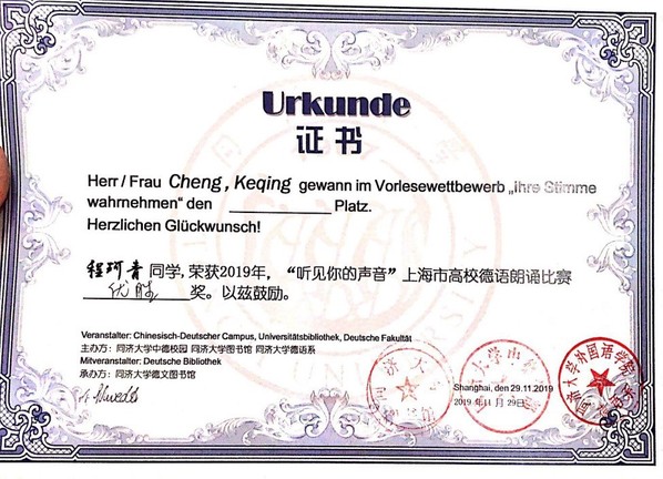 2019年11月29日,由同济大学中德校园、德文图书馆、德语系共同主办的“听见你的声音”上海市高校德语朗诵比赛决赛在同济大学四平路校区德文图书馆二楼报告厅拉开序幕。来自上海市十所高校的20位同学凭借优秀的德语朗诵能力,通过初赛的筛选,成功晋级决赛。决赛按照个人得分进行排名,决出一等奖1名,二等奖2名,三等奖3名,优胜奖6名。决赛选手成绩由专业评委(90%)和现场大众评委(10%)评分组成。我校德语系的汪子璇、李赫明、程珂青三位同学入围决赛,并分别获得二等奖、三等奖、优胜奖的好成绩,受到广泛关注与好评。
