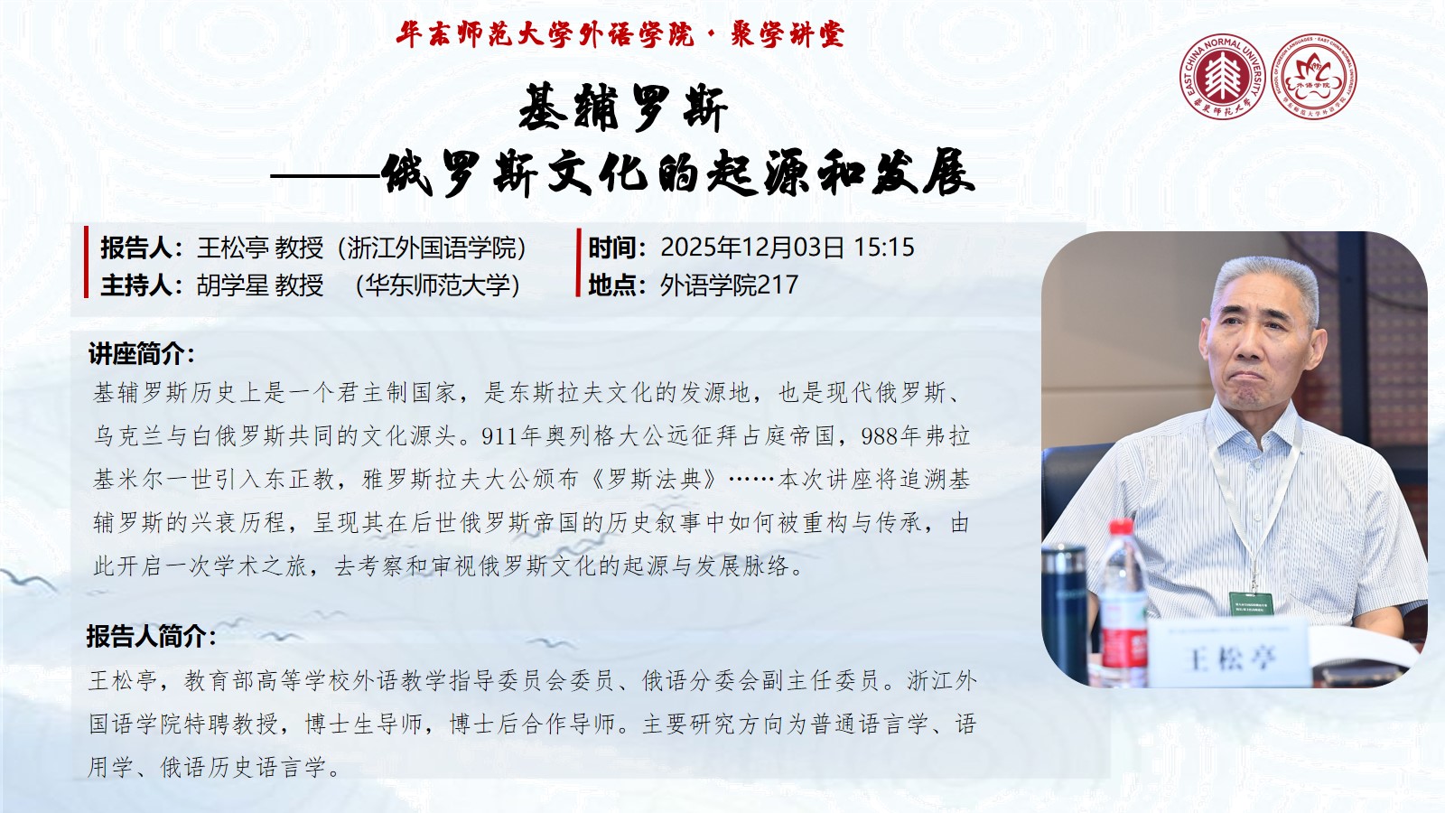 2025年12月3日下午3:00,在自拍流出 217教室举行题为“基辅罗斯——俄罗斯文化的起源和发展”的学术讲座。本次讲座由俄语系策划主办,特邀浙江外国语学院特聘教授、博士生导师、教育部高等学校外语教育指导委员会俄语分委会副主任委员王松亭教授担任主讲嘉宾。俄语系主任胡学星教授、系主任助理班婕老师、张嘉辉老师以及俄语系本科生、硕博研究生共同参加了此次活动。讲座还吸引了历史系、英语系等其他院系的师生慕名前来,现场座无虚席,学术氛围浓厚。讲座由胡学星教授主持。