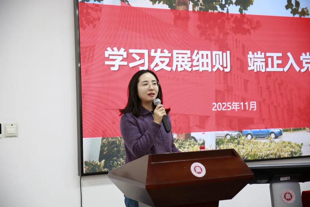 生命科学学院专职组织员赵娟围绕《中国共产党发展党员工作细则》作专题辅导。她系统讲解了发展党员的五个阶段、二十五个具体程序,通过流程图与案例相结合的方式,帮助学员们清晰把握入党全流程。赵娟老师强调,规范流程体现了党组织对党员质量的严格要求,她引导学员深入思考“为什么入党”这一根本问题,剖析自身入党动机,明确党员身份所承载的责任与使命。此次辅导使学员们认识到,只有将个人追求融入党和人民的事业,才能真正实现价值,为学员们端正入党动机、坚定理想信念奠定了坚实思想基础。