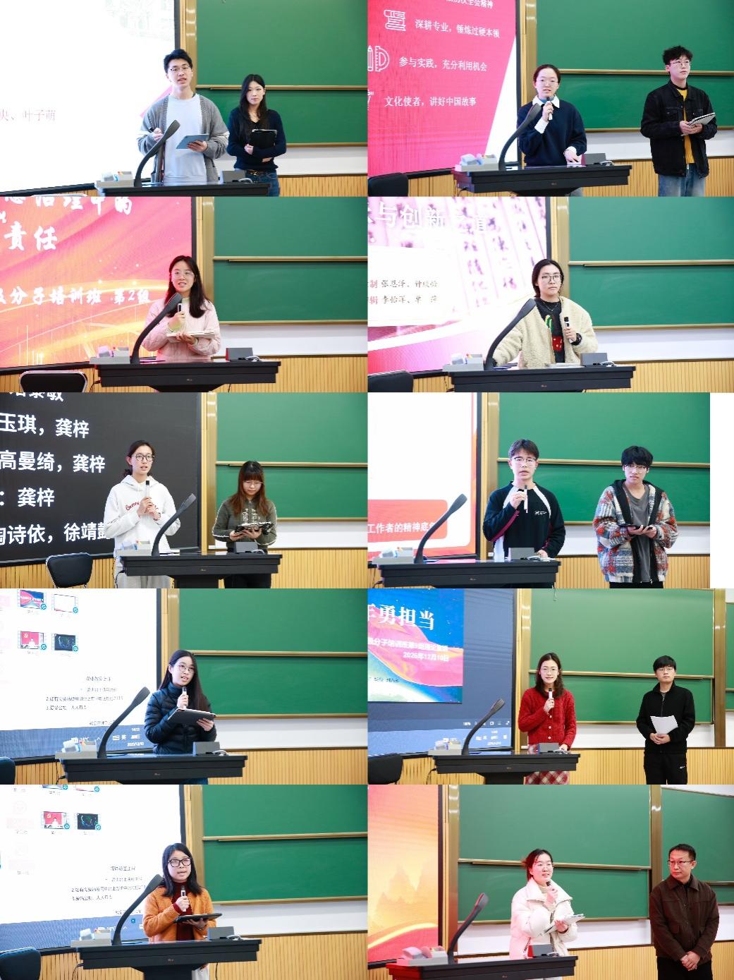 12月10日下午,培训班举办案例汇报与答辩展示环节。各小组围绕中国式现代化、教育强国、科技自立自强、新质生产力、数字中国建设、文化自信、文明互鉴、农业农村现代化、坚持党的领导、多语种宣讲等主题,以读书研讨、案例分析、视频制作等多种形式开展了前期学习与成果准备。在答辩环节,学员们结合所学理论,联系实际案例,进行了系统阐述与生动展示,体现出扎实的理论联系实际能力和良好的团队协作精神。自拍流出 特邀党建组织员侯敏跃教授,学院关工委成员、退休第一党支部书记丁兰兰老师,学术型研究生第三党支部副书记陈舒婷同学和本科生党支部组织委员兼纪检委员杜圣南同学担任评委,对学员们的案例汇报进行点评。