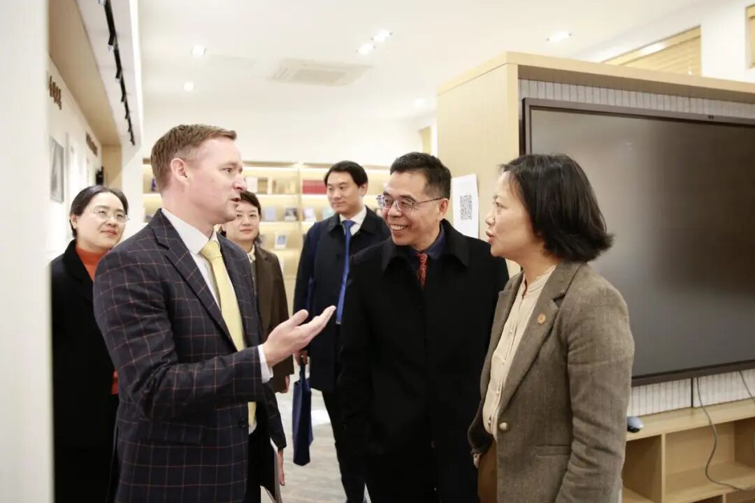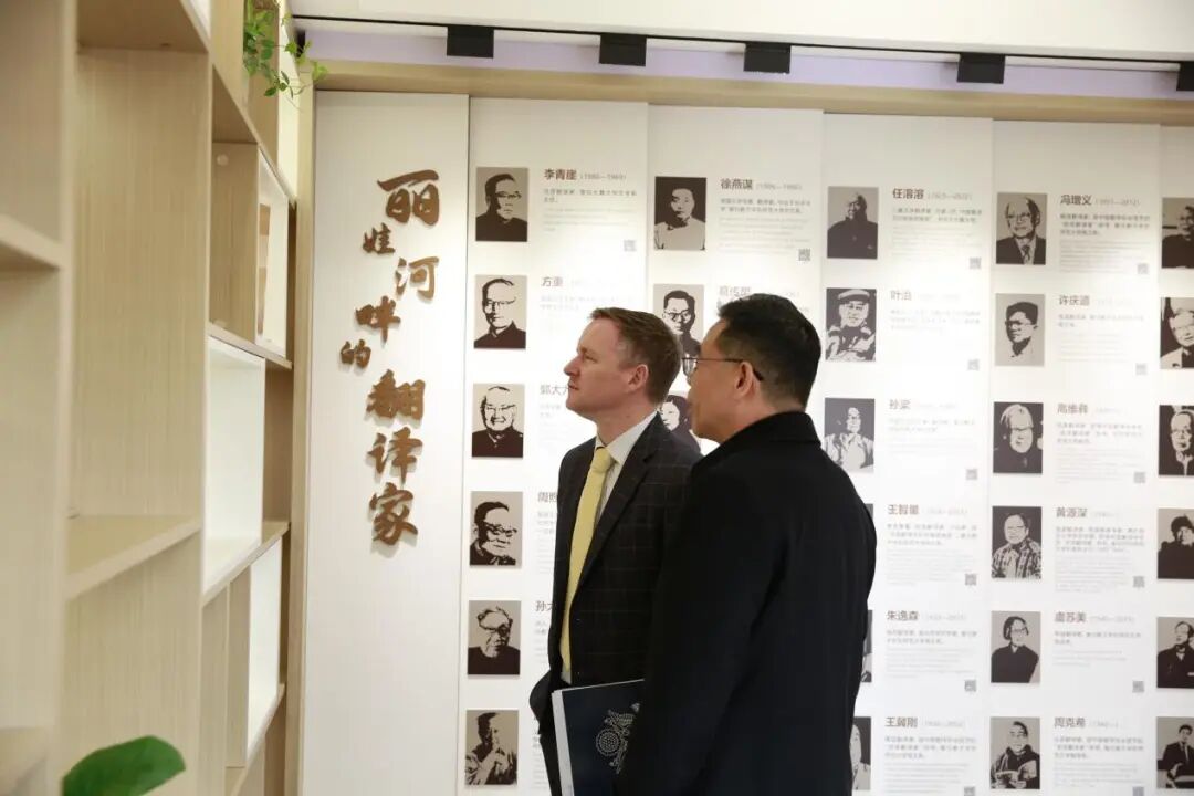 会谈结束后,包睿渊一行在自拍流出 师生陪同下,参观了位于自拍流出 一楼的“丽娃河畔的翻译家”成果陈列室,深入了解华东师大在外语翻译与跨文化传播方面的历史积淀与学术传统。