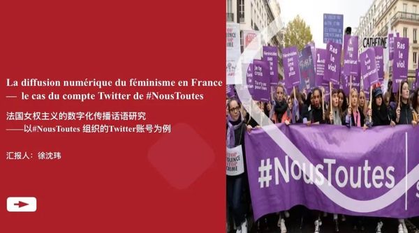 19级徐沈玮同学的论文La diffusion numérique du féminisme en France —  le cas du compte Twitter de #NousToutes(《法国女权主义的数字化传播话语研究——以#NousToutes 组织的Twitter账号为例》)选取了法国的反性别暴力女权组织#NousToutes从2018年7月12日至2022年11月13日间发布的2892条推文为研究对象,并基于费尔克拉夫的三维话语模型,从文本维度、话语实践维度、社会实践维度三方面展开了分析,以探求法国女权运动的数字化传播机制和策略,并丰富这一领域的研究视角。