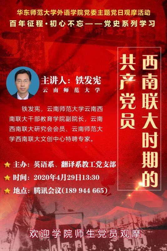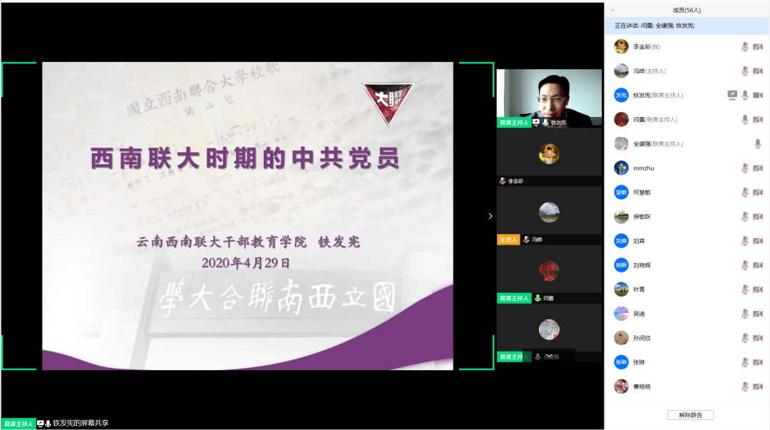 这次主题党日活动中,安排了学院党委 “百年征程·初心不忘——党史系列学习”的第一讲,特邀了云南师范大学西南联大干部教育学院副院长、云南西南联大研究会会员、云南师范大学西南联大文创中心特聘专家铁发宪老师,以“西南联大时期的共产党员”为题,在线上带领大家重温了西南联大的辉煌历史,对西南联大时期的共产党员的英勇事迹和崇高的革命奋斗精神进行了系统深入的学习。
