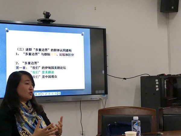 邓惟佳教授的讲座主要围绕其著作《迷与迷群:媒介使用中的身份构建》而展开。她指出迷和迷群是受众在媒介使用中进行身份认同构建的一种方式。《迷与迷群》以“伊甸园美剧论坛”为例进行个案研究,运用深度访谈和观察法为主的质化研究方法,从“社会文化性”受众研究的取径切入,通过研究网上迷群的媒介使用行为,剖析他们在文化层面的实践活动,探究美剧网上迷群的媒体使用行为与身份认同构建之间的关系。她指出,迷群实践活动中自我身份认同构建分为自我意象与他者评价统一、意象与情感投射、反群体的个性消费和角色扮演四个维度,通过这四个维度的途径,受众实现了成功的自己认同建构;受众通过与其他迷群划边界、强化边界和优化边界,实现了群体认同构建。