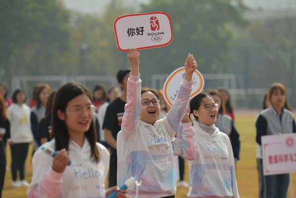 ,奋勇拼搏”所表达的那样,外语学子们将继续奋勇向前,顽强拼搏,秉持运动员精神,做时代的弄潮儿! 闫露老师更是举起印有北京奥运会会标和你好的牌子,加入了表演队列。