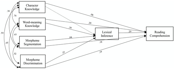 2. 语素意识和词汇知识通过词汇推理能力的中介,对二语汉语阅读理解有直接和间接的影响。研究发现,语素意识和字义知识对汉语阅读理解有显著的直接影响,而字形知识对阅读理解没有直接影响。