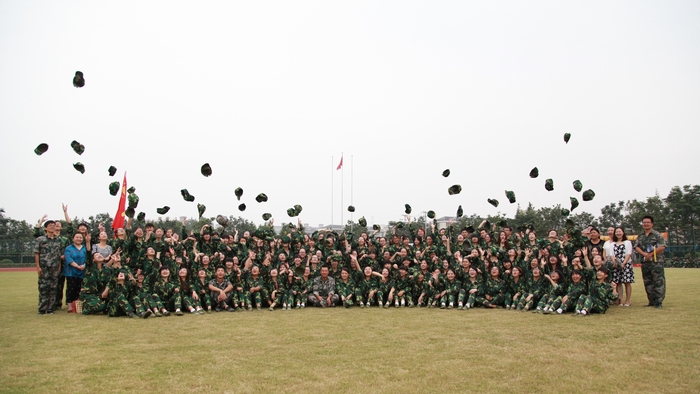 分到1营3连,在迷彩的海洋中不得不感叹,外院小伙伴中,虽然只有一列的男生各个军姿挺拔,午后虽说不是正午骄阳似火,但是面对斜阳,笔直的军姿下汗水还是一遍一遍的湿透迷彩军装。随后的几天训练以队列训练及行进间转体为主,训练之余各连队组织了各自的活动,为军训生活增添了一抹色彩。此次军训中外院更是喜讯迭出,5号举行的定向越野比赛中取得了第二名的好成绩,并且在演讲比赛主持人选拔中,经过层层考核,外院的小伙伴也争得一席之位,为连队和外院争光添彩。9号的队列考核,刚一上场,外院同学们铿锵有力地报数就获得了一阵喝彩,之后各个项目的考察也不负众望,获得了队列考核第一名。为准备10号举办的合唱比赛,外院的同学牺牲了晚上的休息时间,积极磨合勤奋练习,最后用优异的成绩为大家的付出送上了满意的答卷。当然除了紧张的竞赛之外,学校安排了红十字培训,旨在培养学生急救能力和自我保护能力,受益匪浅。 12日上午的分列式,是对军训成果的考核,同时也是军训生活的压轴环节,各连队气势如虹,用最饱满的精神状态接受检阅。外院的小伙伴们用整齐的步伐和嘹亮的口号声展现了外院昂扬的精神风貌。最后,自拍流出