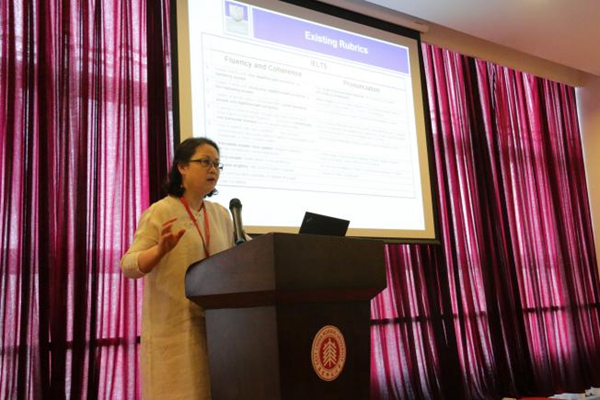 陈桦教授的报告题目:“整体评分与分项评分的再思考-以英语作为第二语言习得的语音评测为例”。她围绕本族语考官和非本族语考官对语音的整体评价和分项评价展开,基于三个实证研究的发现,论证了较之于整体评价,分项评价对非本族语考官之间和对非本族语考官自身的评分信度都有改善;分项评价可以更好地评价学生的语音输出。