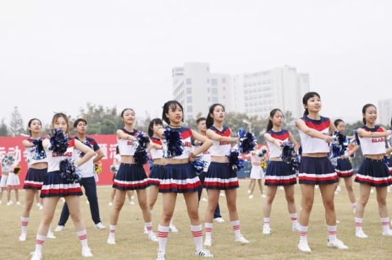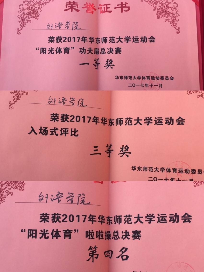 凭借精彩的表演,在入场式评比中荣获三等奖。在宣布完运动会正式开幕后,分别是学生和老师的广播操比赛。外院的同学们或沉静,或舒展,每一个动作都泗溢着他们青春的气息。而外院可爱的老师们,大有一种越活越年轻的气势,到位的动作丝毫不输给同学。