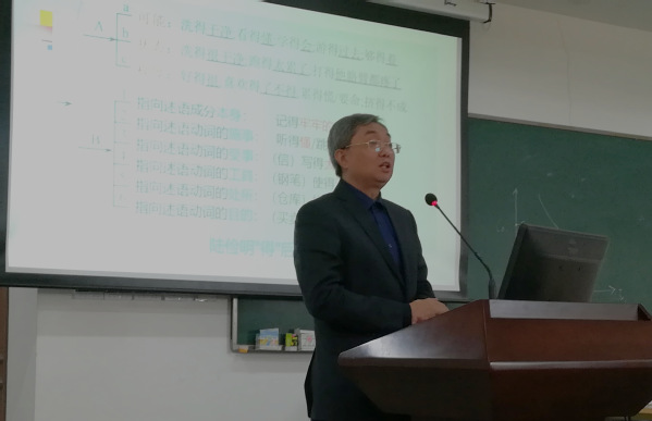 开幕式之后,专家们分别就自己的议题进行了主题讲座。北京大学陆俭明教授首先从“功能-认知”的角度,特别是从语言信息结构思想与构式语法思想相结合的角度,对“施—受—动”里“受”部分的“受限” 与“破限”做出了解释,做了题为《“施-受-动”主谓谓语句“功能-认知”探究》的报告。暨南大学邵敬敏教授报告的主题为《汉语情态网络及其语气词系统》,其对现代汉语语法学界最近的热门议题“情态”和语气词的关系做出了初步探讨,为我们打开了一个崭新的研究视角。复旦大学祝克懿教授在题为《“句子”概念意义的当代阐释》的主题报告中,梳理了中西不同的“句子”观,在语篇语言学、系统功能语言学、互文性理论的视域下阐释了“句子”概念的当代意义。每位专家报告之后,都有相应的提问作答环节,专家学者们就报告提出了发人深省的问题,并进行了深入的探讨。