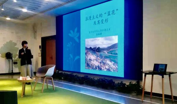 讲座伊始,姜林静老师从浪漫主义时期的时代背景以及蓝花创作者诺瓦利斯的生平两个方面为同学们讲述了蓝花的起源。蓝花最早出现在德国浪漫主义时期的代表人物诺瓦利斯的作品《海因里希·封·奥夫特丁根》中。它的出现,反映出那个时期的诗人对于缥缈却能无限变化着的事物的探索与追寻。在介绍诺瓦利斯的生平时,姜林静老师尤其提到了其未婚妻的去世对他的思想与作品的巨大影响。未婚妻的过世使诺瓦利斯开始思考黑暗与光明,生与死等对立命题的关系,促成他的“索菲哲学观“的诞生,也为”蓝花“的出现埋下了伏笔。