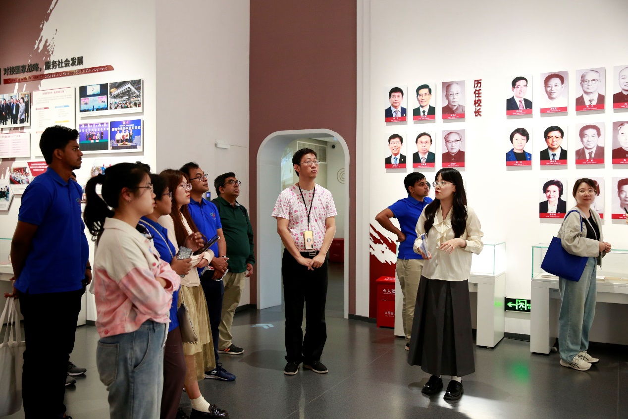 活动伊始,师生与孟加拉国青年领袖访华团的近20名青年学者共同聆听了校史馆的双语讲解。其中,英文讲解由志愿讲解服务队成员、学术型研究生第二党支部党员高婕提供。在校史馆老师细致入微的讲解以及高婕流畅自信的翻译下,师生们通过一个个生动的故事更加深入了解了学校历史,对“求实创造、为人师表”的校训精神有了更加深刻的体会。同时,高婕同学以亲身示范,有效帮助了新队员熟悉了今后的服务流程。