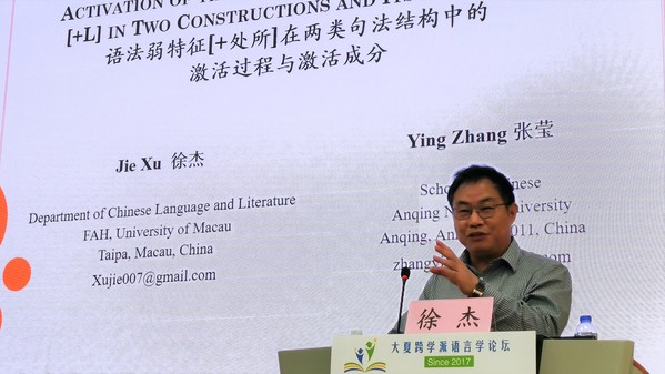 4月27日上午,澳门大学人文学院中国语言文学系徐杰教授做了《语法弱特征[+处所]在两类句法结构中的激活过程与激活成分》的报告,讨论了弱特征激活机制在汉英两种语言中表现出的跨语言系统性差异及其理论意义。