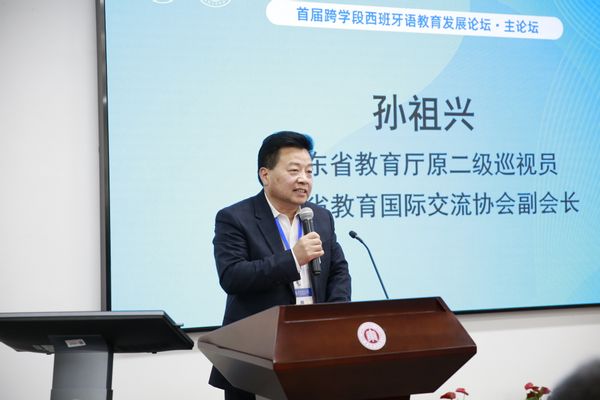山东省教育厅原二级巡视员、山东省教育国际交流协会副会长孙祖兴先生作为特邀嘉宾致辞。他指出,随着中国与西语国家经贸文化交流的不断加深,社会对复合型西班牙语人才的需求日益增长,跨学段一体化培养模式的重要性愈加凸显。他呼吁各界加强协作,推动形成“启蒙—衔接—深耕”的完整教育链条。