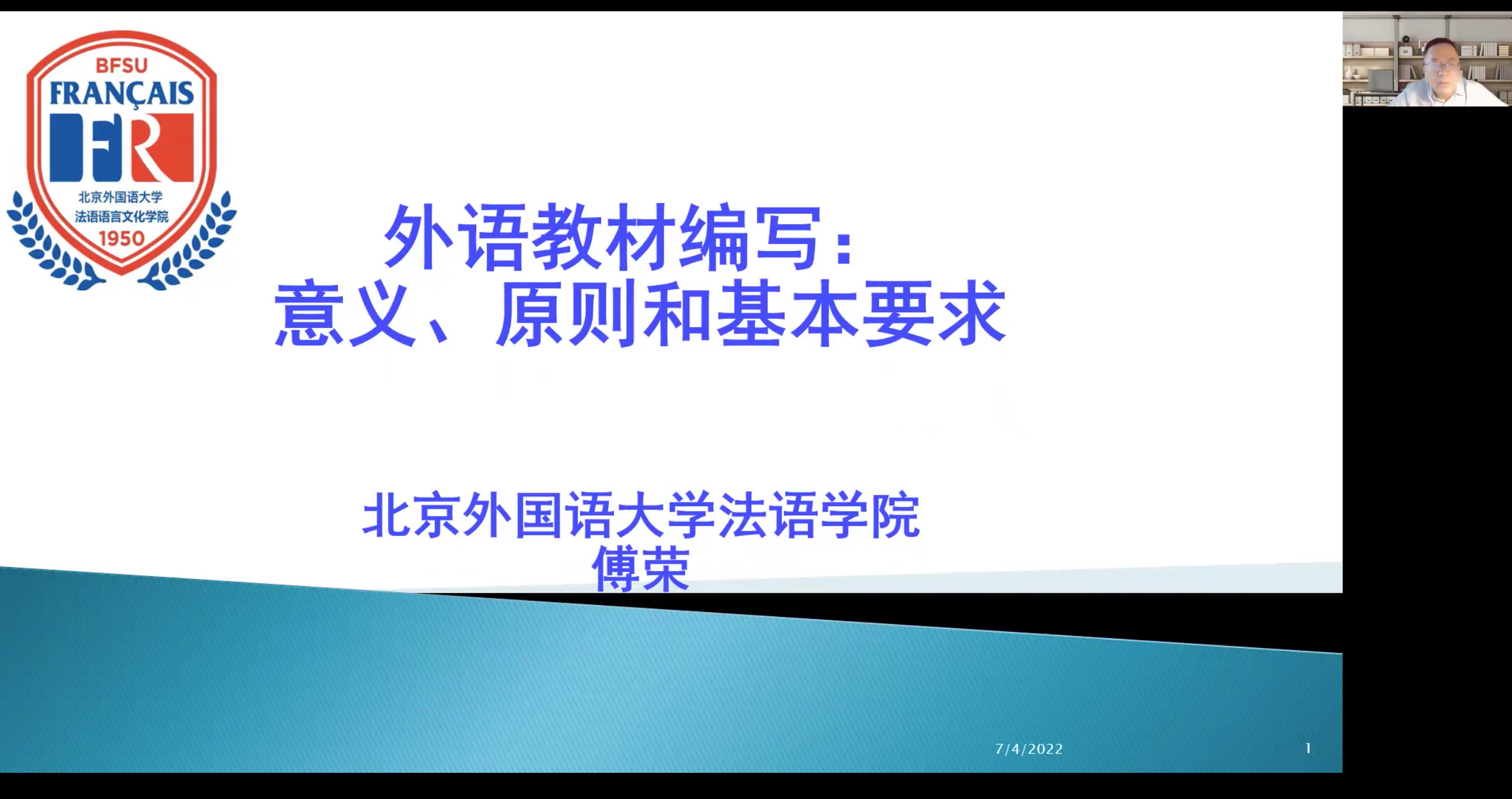 随后,傅教授从教材的思想观念、内容确立、框架设计、教学特性、物理形态等诸多方面出发,提出了编写外语教材的原则及基本要求,并以《法语新经典》系列教材为例,讲解了如何在具体的实践中践行外语教材编写的各项要求。