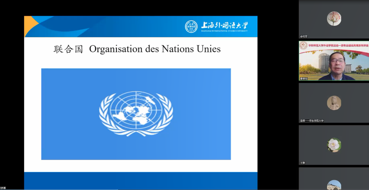 接着,曹教授介绍了法语在当今国际组织中的地位。他聚焦于法语国家及地区国际组织、联合国、欧盟和国际刑事警察组织这四个大型国际组织,详细解说了它们的组织架构、工作性质和职能作用。此外,法语在国际体育赛事以及国际非政府组织和非营利组织中也占据举足轻重的位置。