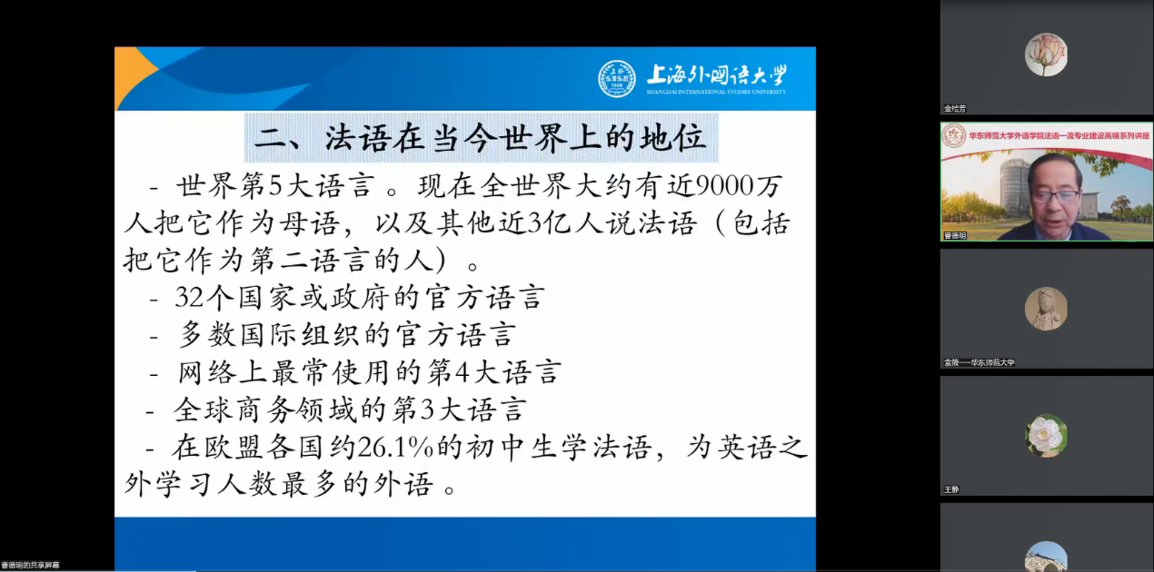 法语一流专业建设高端系列讲座第二讲。讲座由王静教授主持,共计250余名校内外师生通过腾讯会议在线参与。