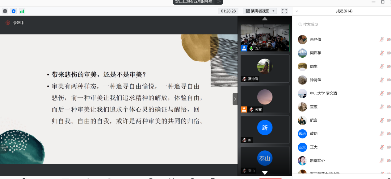 中文系金雯教授。各位专家就如何理解“情感”观念及其哲学、政治、美学和文学价值进行深入探讨,观点既有交锋,又有融合,讨论气氛热烈。来自华师大外院、哲学系和中文系40余名师生参与了线下讲座,浙江大学、北京师范大学、北京外国语大学、复旦大学、湖南大学、暨南大学和东北师范大学等多所高校600余名师生参与了线上直播。