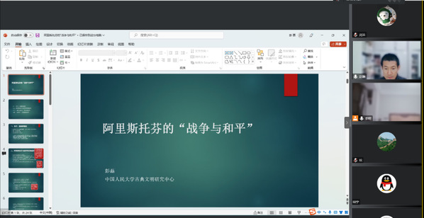 邀请,中国人民大学文学院副教授、古典学教研室主任、中国比较古典学会常务理事彭磊副教授做了主题为“阿里斯托芬的‘战争与和平’”的讲座。本次讲座是“古希腊文学与思想史”系列讲座第3讲,由英语系罗峰副教授主持,200余名校内外师生通过腾讯会议和B站在线参与。