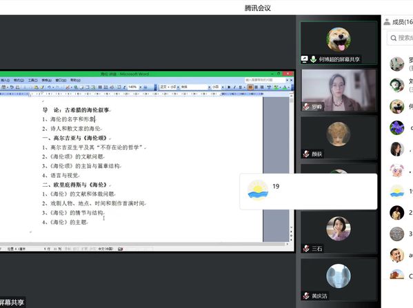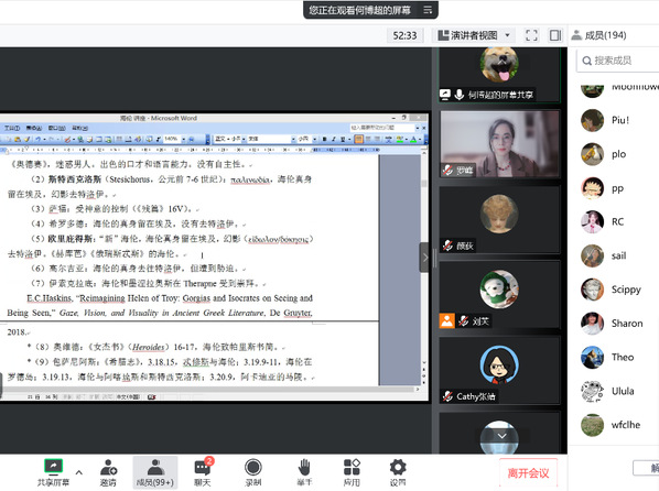 师生做了主题为“智术与悲剧:从高尔吉亚的《海伦颂》到欧里庇得斯的《海伦》”的讲座。本次讲座系“古希腊文学与思想史”系列讲座第5讲,由英语系罗峰副教授主持,200余名校内外师生以腾讯会议和B站的方式线上参与。