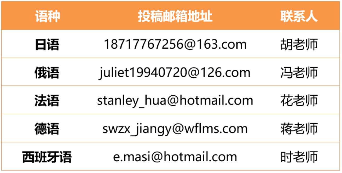 8.投稿截止时间为:2023年4月30日,各语种投稿邮箱如下。