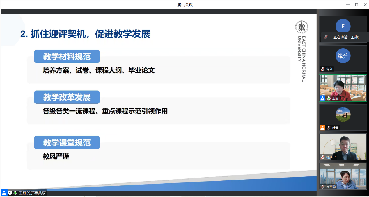 成立了专项工作组,全面扎实推进审核评估各项工作有效开展。她强调,全院教师要凝聚共识,同心协力,紧抓迎评契机,推动学院本科教学质量提升,实现以评促建、以评促改、以评促管、以评促强。随后,她就审核评估具体工作环节流程进行介绍,希望老师们以平常心,开放态迎接评估工作,保持正常教学秩序,做好后续访谈座谈。