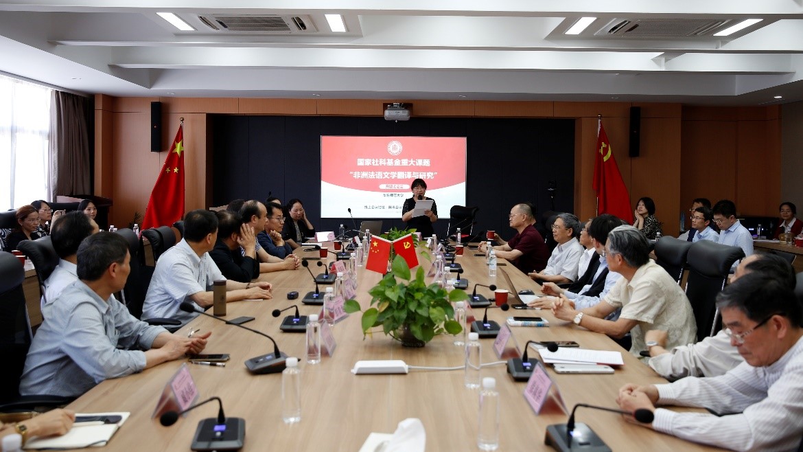 专家咨询论证由法国文学专家徐真华教授主持。外国文学专家刘建军教授、陈建华教授、石坚教授、彭青龙教授、朱振武教授、陆建德教授、尚必武教授先后对研究对象、概念梳理、研究方法、纲目排列、咨政报告提交等大方向以及场域、法语写作、非洲文化现代化进程等细节问题上发表了富有启示的见解。随后,非洲研究专家刘鸿武教授在线上与大家分享了自己对课题的看法。他认为该课题涉及全新的领域,符合国家战略需求。在研究该课题时,可从西方话语对非洲消极解读切入,从而论及非洲文化复兴问题。此外,他还建议采用本土合作的方式,鼓励研究团队赴非洲考察当地艺术诗学之美,增进与非洲学者的交流与合作。接着,法国文学专家罗国祥教授、余中先教授、张新木教授、李建英教授、黄荭教授、刘海清教授、袁莉教授分别发言,他们一致认为该项目具有很高的学术价值,项目申报团队实力突出,方案切实可行,成果值得期待,并就非洲整体性和多元性问题、文献梳理、项目具体实行细则、不同国别视野等话题展开热烈讨论。最后,上海译文出版社副总编黄昱宁表示,译文出版社虽然多年深耕于法国文学,但过去勾勒的版图并不完整,他们将把目光投向更广阔的法语世界,出版非洲法语文学系列丛书。她认为“非洲法语文学翻译与研究”这个课题与译文社的气质和目标有很高的契合度,她对翻译和研究丛书都充满信心,并承诺权利全力支持课题和出版的相关事宜。