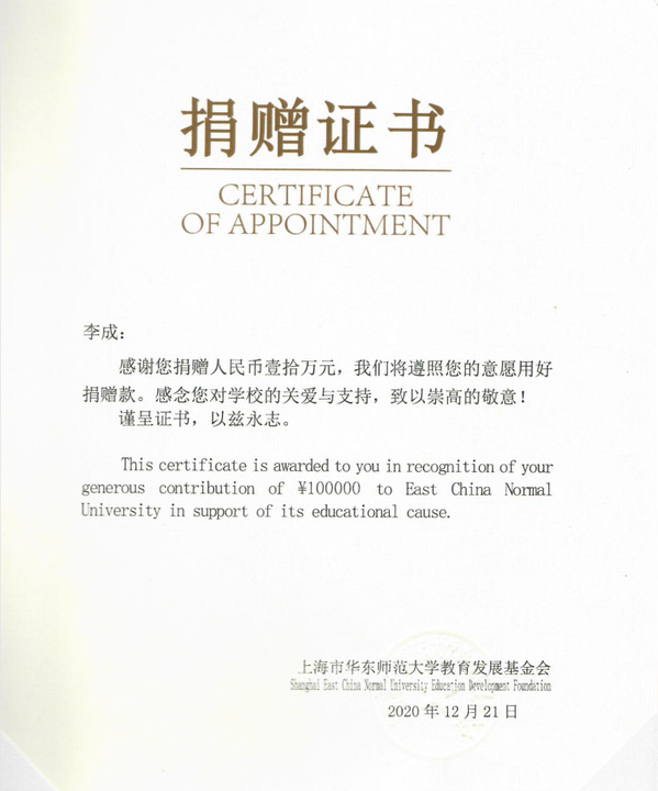 2020年12月21日,自拍流出 杰出校友李成先生向自拍流出 教育发展基金会捐赠人民币10万元,设立“自拍流出 李成发展基金”项目,用于自拍流出 的学生奖助学金和教师队伍建设。