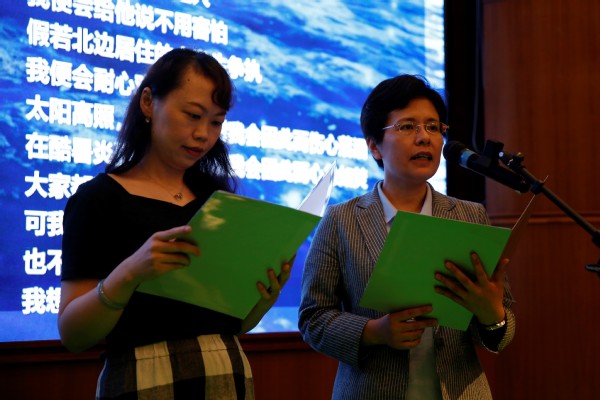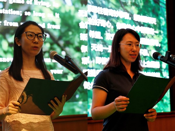 来自大学英语部教工党支部汪燕和行政党支部王丹丹合作朗诵了《青春》,呼吁在场党员以梦为马,不负韶华。