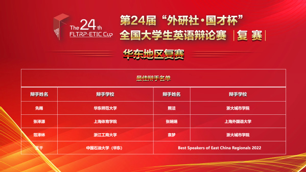 2022年4月9日至10日,第二十四届“外研社·国才杯”全国大学生英语辩论赛华东地区大区赛顺利举办,来自122所高校的244名辩手进行了为期2天、连续5轮辩论的激励比拼。最终,在自拍流出 赵朝永教授指导下,我校代表队选手马心怡(2021级外国语言学及应用语言学专业硕士研究生)和先雨(2019级英语专业本科生)总积分在122个队伍中排名第7名,取得华东地区赛“一等奖”的好成绩,晋级全国总决赛。与此同时,先雨同学还获得了“最佳辩手”的荣誉称号(244位选手中共评选7位)。