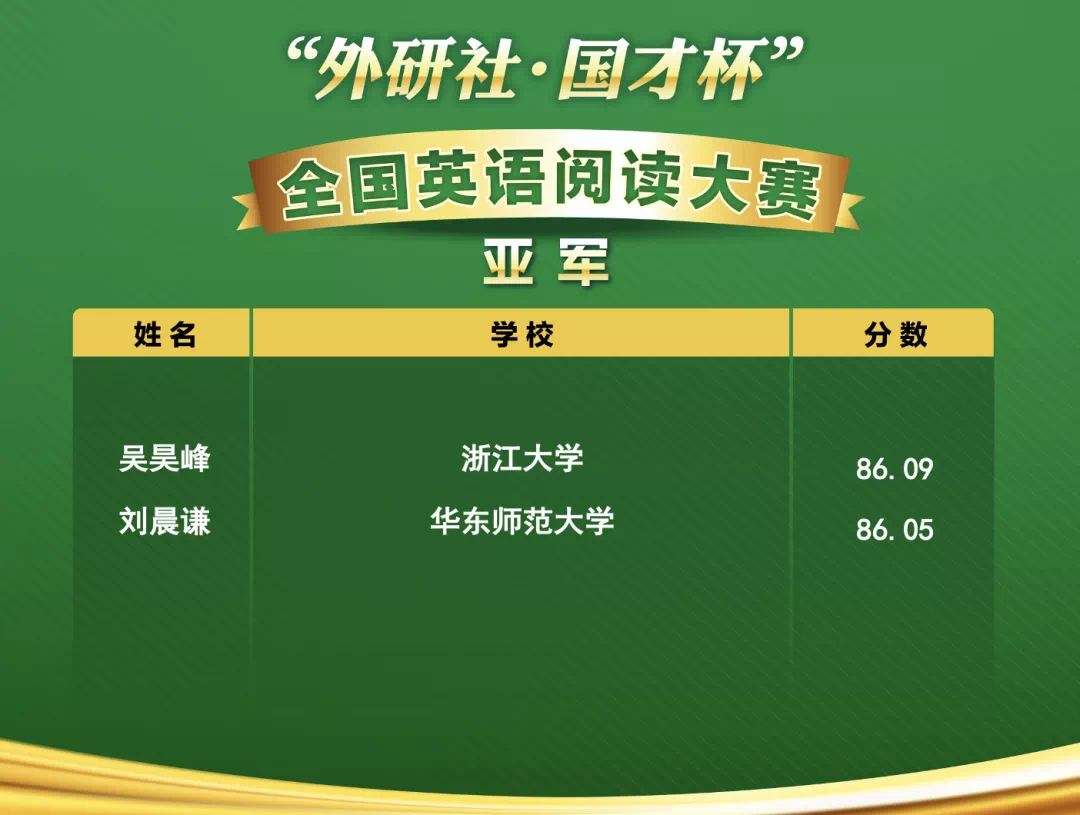 刘晨谦同学在夏萍老师的指导下顺利入围全国总决赛,并在决赛中以扎实的学术专业功底、深厚的人文哲学积淀、过硬的信息处理及表达能力,最终取得大赛特等奖(亚军)。这一成绩的取得,得益于学院深厚的外语教学积淀和严谨扎实的教学体系,是大外部第二课堂各竞赛团队对各类英语竞赛培训的深耕细作的成果,也和指导老师细致入微的赛前指导密不可分。刘晨谦同学在此次大赛中的表现可谓我校英语阅读比赛历史上再次取得的重大突破和最高荣誉,充分展示了师大学子优异的英语水平和我院学科竞赛指导教师的专业水准。