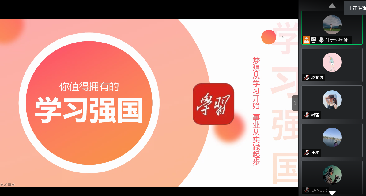 最后,冯烨鼓励大家从今天开始行动起来,各支部可以通过“答题比赛”、“积分竞赛”等方式促进大家的学习劲头。她强调,学习最重要的还是能够实现自我提升,希望大家能好好利用学习强国的丰富资源,努力充实自己。同学们纷纷表示,“学习强国”是一款“宝藏APP”,今后一定要将上面多种多样的学习材料充分利用起来,相互督促、互相分享,始终保持高涨的学习热情,实现自我的全面发展。