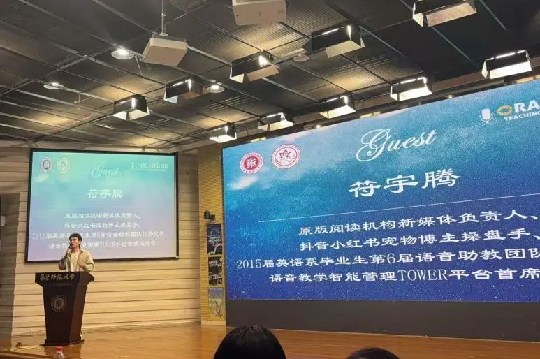 随后,第10届语音大赛总指挥、语音大赛徽标设计者、现任上海敬业中学教师高中年级组长张海影,原版阅读机构新媒体负责人、抖音小红书宠物博主操盘手、2015届语音教学智能管理TOWER平台首席运行官符宇腾,2015届语音助教团队负责人、语音助教选拔心理测试首席设计师、现Zentrix MedTech创始人&CEO安晓东分别发言。他们感谢母校的培养,感谢自拍流出 助教团队提供的宝贵教学实践、教学管理、团结合作成长平台,寄语学弟学妹脚踏实地,放眼未来,让语音赋能未来全球胜任力。