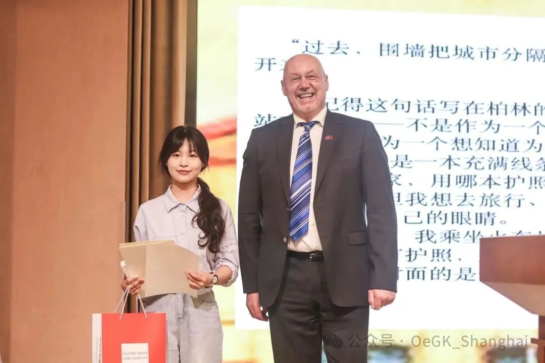 近日,第十二届奥地利驻上海总领事馆“德语写作比赛”颁奖典礼在复旦大学邯郸校区举行。在本届比赛中,德语系2023级本科生黄静宜荣获一等奖,奥地利驻上海总领事蓝海睦先生亲自为其颁发奖状。