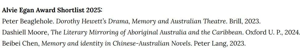 近日,澳大利亚文学研究协会(ASAL)公布了2025年度Alvie Egan文学评论奖提名名单,我院晨晖学者陈贝贝老师的学术专著Memory and Identity in Chinese-Australian Novels成功入围,成为该奖项设立以来第二位获提名的非英语国家研究者,标志着中国学者在澳大利亚文学研究领域的国际影响力日益提升。