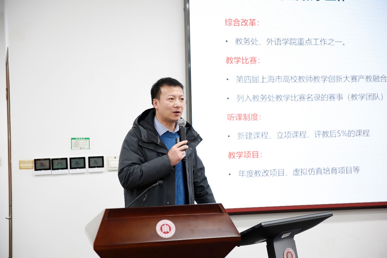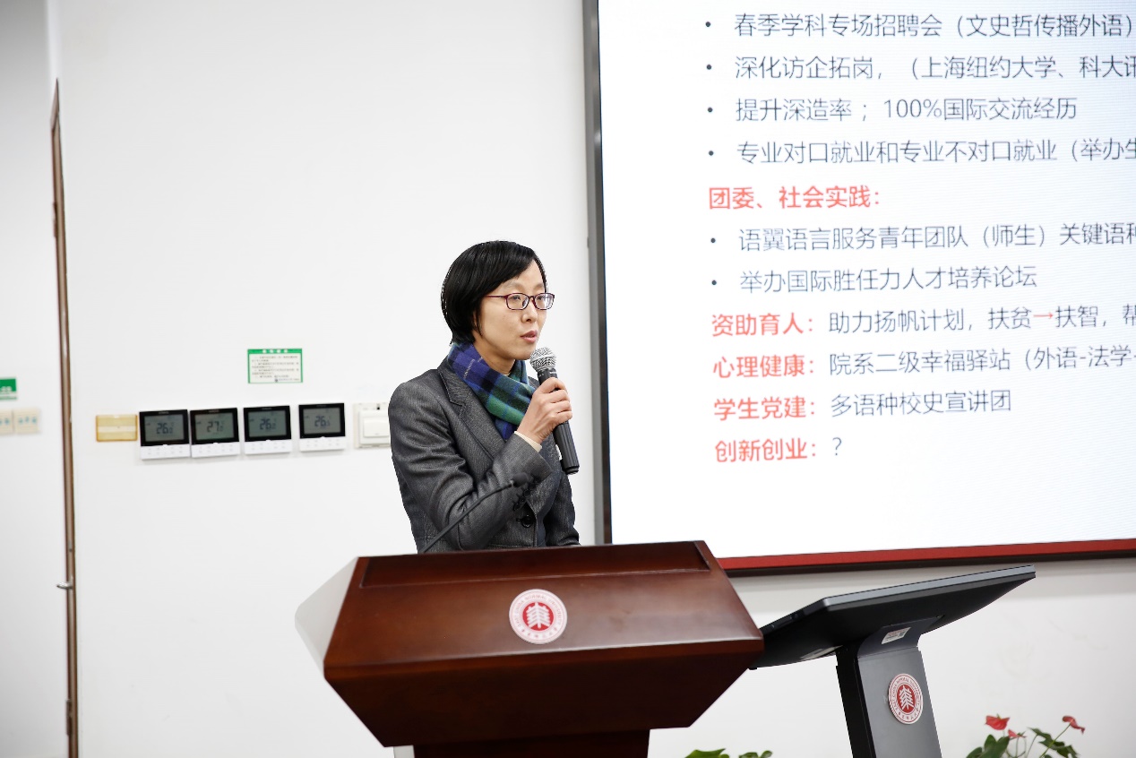 院长兼党委副书记杨延宁通报了学院本学期五大重点工作,即加强党建引领,推动党建与事业发展“一融双高”;坚持立德树人根本任务,对接卓越育人工程;心怀“国之大者”,对接卓越学术工程;服务社会发展,对接卓越服务工程;提升治理水平,落实一流行动保障。他指出,面对“外语学科如何对接国家战略?如何对接新一轮科技革命和产业变革?如何对接学校“双一流?”三大问题,学院顺势而为、紧抓机遇、集思广益提出破题之举。2024年,学院将持续打破界限,整合各方资源,以“双语双科” 复合型人才培养为核心,以师范生贯通式培养和语言智能方向建设为增长点,通过“一系一策”发展思路激活各专业优势特色和改革动力,通过高水平、多元化语言教学与服务助推全校卓越人才培养。
