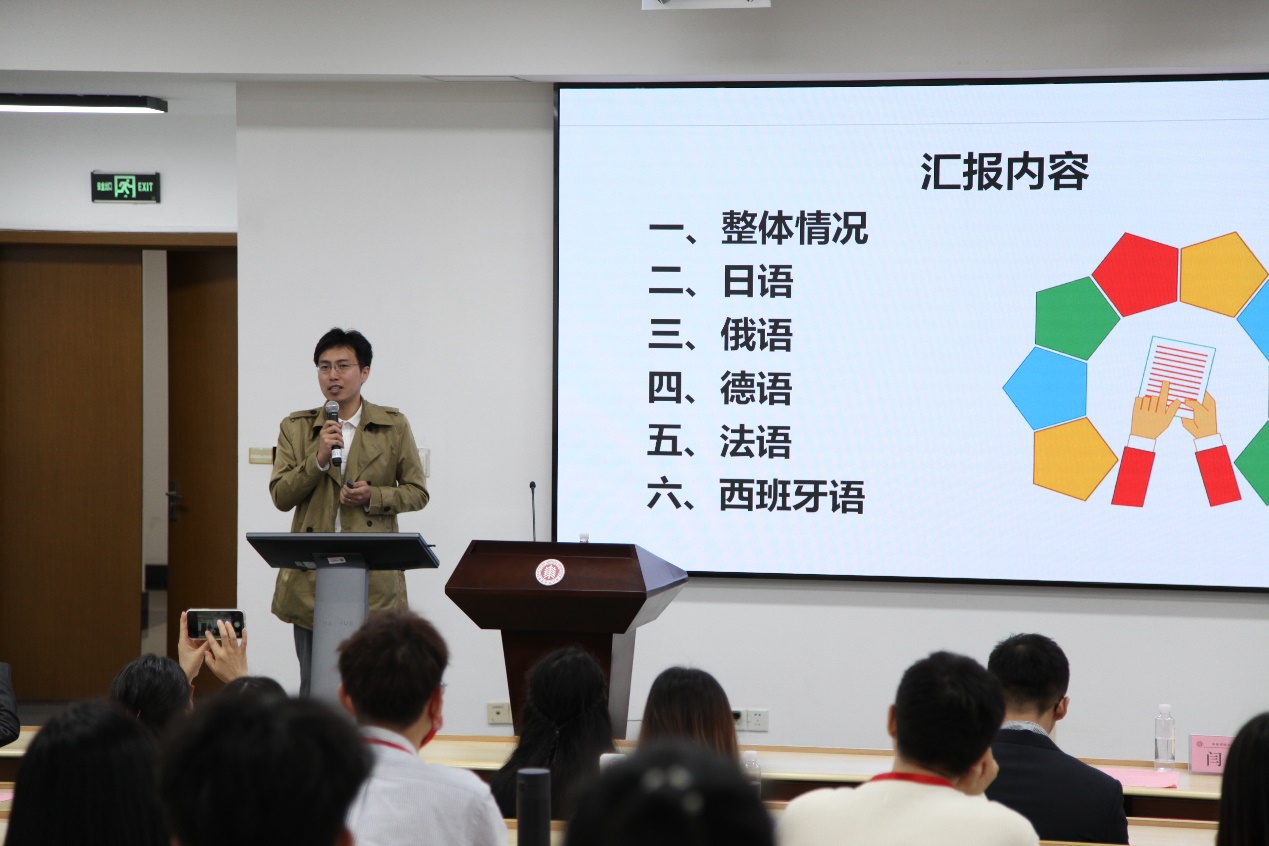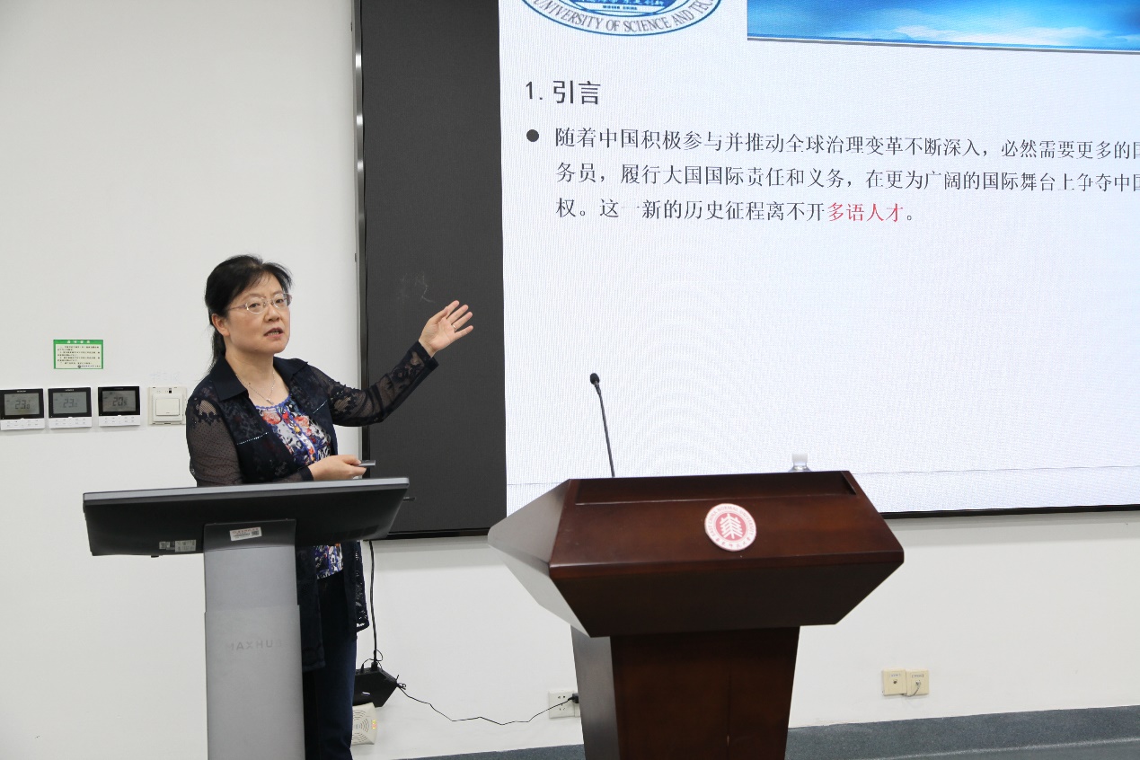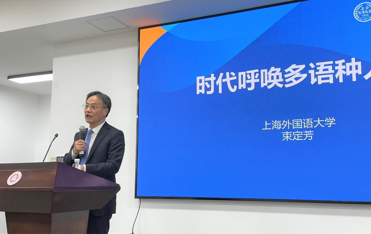 束定芳教授围绕“时代呼唤多语种人才”开展主旨报告。基于多语种对个人成长、国家发展以及学校特色建设的需求,他提出了以“早起点、一条龙、双外语、多专业、聚焦区域、国际交流”为特点的多语种人才培养理想模式,通过局部试点、特殊政策等实施方式,以期破解上海部分中学多语种教学尝试中出现的难题,为学生打造良好的多语种学习环境。他指出,加强多语种师资培养应从职前教育和教学研究两方面着手,将理论研究与教学实践联系起来,为关键语种人才培养系统化、规范化增添动力。