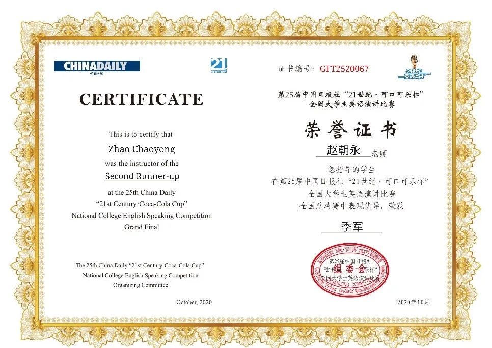 From October 5th to 8th, The the semi-finals and finals of the 25th China Daily "21st Century Coca-Cola Cup" National College Students English Speaking Competition was were held from October 5th to 8th, 2020 at Guangzhou Baiyun International Conference Convention Center. Wang Yan, instructed by Associate Professor Zhao Chaoyong, won the second runner-up in the grand final. Zhao Chaoyong, Associate Professor of College English Teaching Department led Wang Yan from the Department of Law to participate in the competition. Wang Yan was the champion of last year’s competition. This year, faced with In the finals with strong players and fierce competition, Wang Yan once again demonstrated extraordinary strengthcompetence. , qualifying first in the semi-finals, and finally won the national third place in the finals.