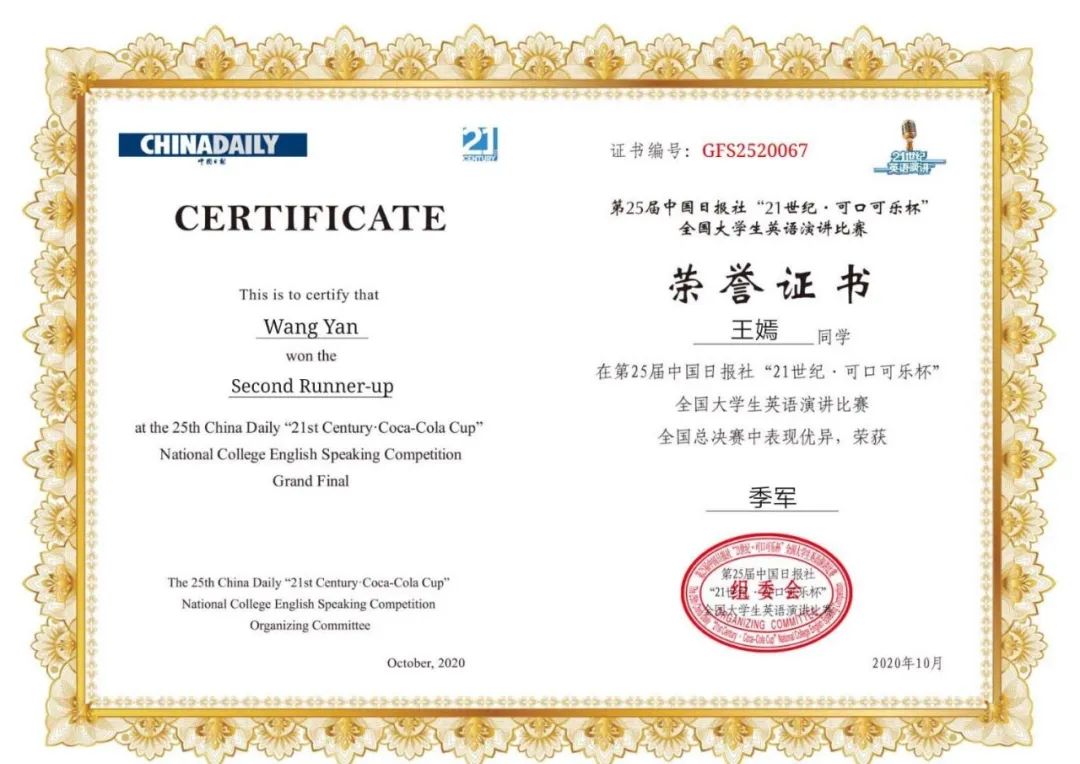 The theme of this year's national semifinals is “No person is an island” , and the theme of the national finals is “Seize the day”. In her speech, Wang Yan used vivid and authentic examples to explained that why "Being true to oneselfpersistence to true self" is the essence of “Seize the day ”with real and vivid examples, authentic spoken language, and quick thinking, and accurately and answered the questions of the judges in idiomatic spoken English. Her performance reflects her , which fully reflects the students of her solid English skills, excellent critical thinking ability and excellent psychological qualitythe ability of staying calm under pressure. In the end, Wang won the third place and “Coca-Cola China Power of Care Special Award”.Wang Yan successfully won the national third place. At the same time, she also won the special award for "Care for Power" in China.