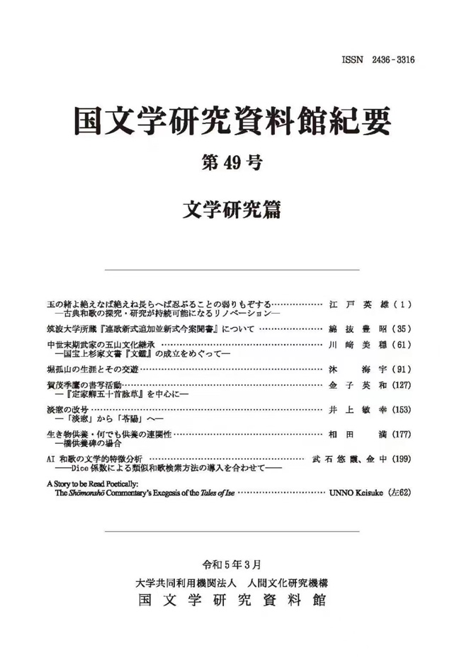 尤海燕老师指导博士生沐海宇在《国文学研究資料館紀要》第49号「文学研究篇」上发表论文“堀孤山の生涯とその交遊”。
