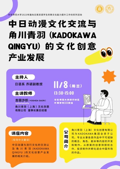 角川青羽(上海)文化创意有限公司董事长兼总经理吉田沙织来学院讲座:《中日动漫文化交流与角川的文化创意产业发展》。