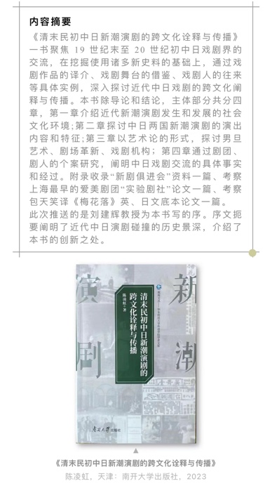陈凌虹老师的专著《清末民初中日新潮演剧的跨文化传播与阐释》由南开大学出版社出版。