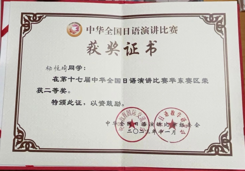 尹松老师和石冈洋子老师共同指导本科生杨悦琦参加“第17届中华全国日语演讲比赛”华东赛区决赛,获二等奖。