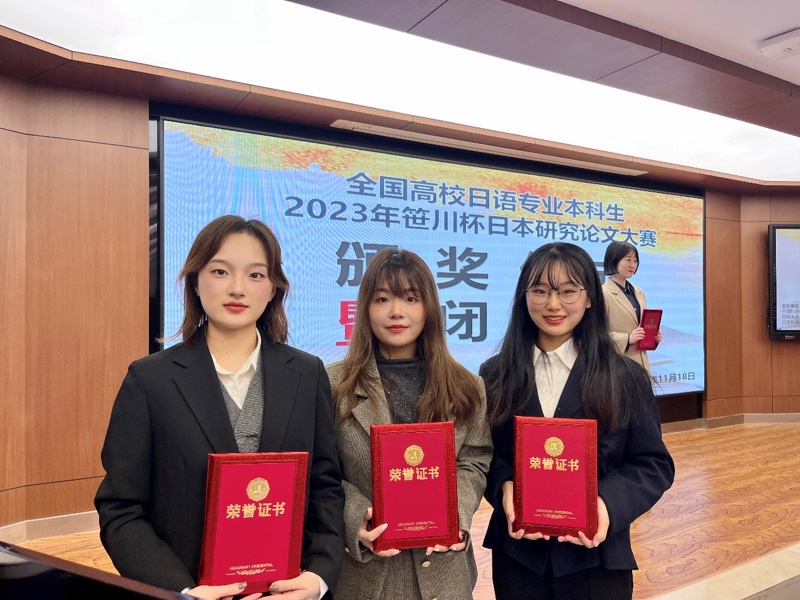 日语系2020级本科生和平鸽、周桢、周佳璇获语言学组一等奖,三等奖、优秀奖,2020级本科生隆宇萱获文化组三等奖,2020级本科生张诗铱、2021级本科生袁冰心、毕展榕获文化组优秀奖。吴红哲、尹松、唐权、乔颖、金晶、陈凌虹6位老师获优秀指导教师奖。