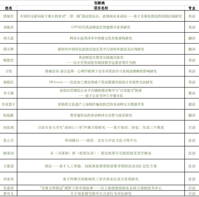 金晶老师指导本科生吴嘉欣获上海市大学生创新创业项目(“全球闻名倡议”视野下的中国叙事——以上海博物馆和东京国立博物馆为中心)已立项(市级);乔颖老师指导本科生黄可儿、黄瑞瑶获上海市大学生创新创业项目(“关于场景描写中的中日言语行为对比研究”) 已立项(校级);尹松老师指导向依纯获得学校大学生创新创业项目(“日语专业大学生“动词ない形”声调习得研究-基于知识、直觉、生成三个维度”)已立项(校级)。